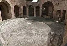 There were several phases of construction for the baths. The Forum Baths were initially built during the reigns of Emperor Antoninus Pius[9] c. 160 C.E. with subsequent additions during the Severan Dynasty (193-225 C.E.), reign of Maxentius and Constantine (306-337 C.E.), and finally during the reign of Theodosius (379-395 C.E.).[10][11] The Baths were constructed in the city center and were the largest of all Ostia baths with a large palaestra south of the main building.[12] The Forum Baths are characteristic of the experimental mode of planning during Hadrianic-Antonine period.[13][14] The structure may have reached 15–17 meters tall, although not as high the remains are still impressive. Along the southern face of the building are the warm rooms of the bathhouse, placed to take advantage of the sun's passive heating.[15][16] Here a modern visitor can see the octagonal sun-bathing room (heliocaminus), an elliptical sweating room (laconicum) two tedpiaria and a caldarium with three pools.[12] The palaestra was surrounded on three sides by porticos which shaded the entrance to shops.[17] Many hairpins were recovered during excavations proving that the baths were used by women. It is assumed that this would be at a separate time of day from men, but no clear evidence exists.[18]