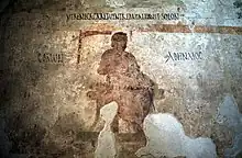 This bath complex (III, X, 2) creates a city block with houses to the north and the south (House of the Charioteers and House of Serapis) from the late Hadrianic/early Antonine period.[58] It is possible this bathhouse was only intended for the residents of the two adjoining insulae.[34] The bath is named after a satirical painting of seven Greek philosophers found in a room that was formerly a tavern and later used as the apodyterium,[59] the philosophers are identified by their names and city of origin written in Greek and a humorous and ironic Latin inscription referring to latrine activities.[60] The central hall contains a mosaic with 5 concentric rings depicting hunting scenes. The room adjacent to the natatio is a fresco of Venus Anadyomene.[58][24]
