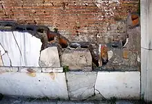 The Baths of Silenus (IV, IX, 7) were discovered in 2011 as a part of the work of the Ostia Marina Project at the University of Bologna. The 400-square meter structure was built along the ancient coastline in the extra-urban neighborhood beyond the Porta Marina Gates.[76] Brick stamps recovered suggest an initial construction of 123-126 C.E. with later reuse during the Late Antique period of Ostia The name comes from the marble revetment depicting Silenus.[77][78] The baths appear to be a part of suburban revival initiated by Hadrian in the Porta Marina area in conjunction with the Porta Marina Baths.[79]