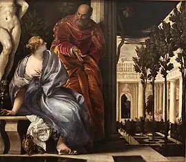 - The theme of Susanna is suggested by the presence of the fountain and an old man, but there is only one (if one considers that the elders are the ones in the arcades, while the presence of man in red in the foreground is inexplicable).