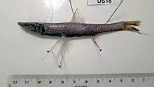 Bathypterois is a genus of deepsea tripod fishes. They are a diverse genus that belong to the greater family Ipnopidae and order Aulopiformes. They are distinguished by having two elongated pelvic fins and an elongated caudal fin, which allow them to move and stand on the ocean floor, much like a tripod, hence the common name.[2] Bathypterois are distributed worldwide with some particular species of the genus having specialized environmental niches, such as lower dissolved oxygen concentrations.[3] Bathypterois have a reduced eye size, highly specified extended fins, and a mouth adapted to filter feeding.[2] They are filter feeders whose main food source is benthopelagic planktonic calanoid copepods, but some variation is seen with maturity in secondary food sources.[4] Bathypterois use their three elongated fins for a wide range of motion from landing to standing on the ocean floor to catching prey, for which these fins serve as specialized perceptory organs.[2] Bathypterois have both male and female gonads at once making, them simultaneous hermaphrodites, whose gonads go through five stages of development following seasonal autumn spawning.[5]