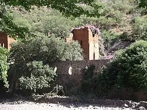 One of the most prominent structures, Hacienda San Miguel, was originally erected in the mid seventeenth century, some thirty feet above the Río Batopilas, opposite the town. It was enlarged and rebuilt in the 1740s by Don Juan José de Rivolta, who turned it into a medieval-style castle, surrounded by guard towers and defensive walls. Rivolta made a fortune in Batopilas, and wielded significant power in the area, holding among other titles, that of alcalde (mayor).[5] Following Rivolta's death, the hacienda was occupied by Rafael Alonzo Pastrana, who discovered several rich silver veins in the area. Between 1730 and 1750, the Pastrana vein is estimated to have produced 48 million pesos, making its owner one of the richest men in the world. Pastrana further expanded the hacienda, enlarging the living quarters, and the ore processing facilities. Near the end of eighteenth century, Don Ángel Bustamante took over the hacienda and the Carmen mine. Between 1790 and 1820, the mine produced over 30 million pesos worth of silver ore.[6]