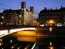 • Pont Battant: Originally this was an ancient Roman stone bridge with five arches and a width of about 4 metres. For long times it was the only bridge over the river Doubs.[1] During the Middle Ages and renaissance the bridge was repaired and modified several times.[1] At the beginning of the 20th century, the Pont Battant consisted of the main three arches, the river Doubs flew through, a small arch at the old town river bank and an even sized arch at Battant quarter end that was actually a 90 degree tunnel, beginning under the riverside Promenade heading through the arch (that days under a street crossing; see postcard dating 1906) and ending under the Promenade on the other side. Unfortunately the bridge was partially destroyed during World War II and restored as a provisional solution.[1] The replacement bridge, built in 1953 in concrete, had only a single arch, the design being intended to reduce the risk of flooding, like the January 1910 Doubs river flood. The bridge was often the site of an informal market where one may buy things from Sub-Saharan Africa due to its deck of 60 x 17 metres. After 60 years the concrete bridge had to be replaced. At 10. March 2012 Besançon city organized an event that ends up with the symbolic burning down the Pont Battant.[2] The bridge was shut in April. Disassembling began in May.[1] A pedestrian bridge was built on an interim basis. This temporary bridge was deconstructed, when 20. June 2013 the new bridge partially opened for those walking footpaths and for bicyclists only.[3] The new Pont Battant was tested to take the weight of 400 tons, although it will have to withstand a calculated max weight of 160 tons. It passed the test at 28. October 2013.[4][5] The first tram, named after the French writer "Victor Hugo", crossed the new Pont Battant 15 January 2014.[6] The new bridge has a single arch made of 1,100 tons of steel filled with 800 tons of concrete. It spreads 60 metres (the bridge segment is 65 metres), at a width of 24 metres and costs 7 million Euros. On the surface a mixture of resin and sand was spray coated.[7] The immense width is needed to provide enough space for the 90 degrees curved rails for trams and a wide sidewalk. Until now (March 2014) several love locks were installed at the steel wire net of the railings. The first love locks were seen a few months before the reconstruction ended 30. November 2013.[8]