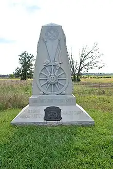 The battery saw its first action in the Battle of Aldie on 27 April 1863, suffering no casualties. It returned to Fairfax Court House three days later and when the Gettysburg campaign began marched from Fairfax Court House to Drainsville on 24 June. Continuing via Frederick and Taneytown, Maryland, the battery arrived at Gettysburg on 2 July. It fought in the Battle of Gettysburg on 3 July with the loss of one man killed and four wounded. Another was wounded two days later, before the battery marched from the battlefield on 8 July for Berlin, Maryland via Creagerstown and Boonsboro. From Berlin the battery moved to Warrenton Junction via Uniontown, Virginia and Piedmont. After its arrival at Warrenton on 25 July, the battery moved forward to rejoin the army at Culpeper Court House.[4]