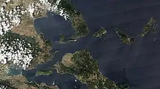 Following Thermopylae, the Persian army burned and sacked the Boeotian cities that had not submitted to them—Plataea and Thespiae—and then marched on the now evacuated city of Athens.[80] Meanwhile, the Allies (for the most part Peloponnesian) prepared to defend the Isthmus of Corinth, demolishing the single road that led through it, and building a wall across it.[81] As at Thermopylae, to make this an effective strategy required the Allied navy to stage a simultaneous blockade, barring the passage of the Persian navy across the Saronic Gulf, so that troops could not be landed directly on the Peloponnese.[82] However, instead of a mere blockade, Themistocles persuaded the Allies to seek a decisive victory against the Persian fleet. Luring the Persian navy into the Straits of Salamis in September, the Allied fleet was able to destroy much of the Persian fleet, which essentially ended the threat to the Peloponnese.[83]