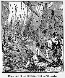 Around ten days later, the Persian army arrived at Thermopylae, and the Allies at Chalcis were informed by a ship, captained by Abronichus, which had been appointed to liaise between the army and the fleet.[28] However, there was still no sign of the Persian fleet, and the first day the Persians spent at Thermopylae passed without them launching an attack.[32] The next day, the Persian fleet finally drew near to Artemisium, heading for the Gap of Skiathos (between the coast of Magnesia and Skiathos), when a summer gale (a 'Hellesponter' – probably a north-easterly storm[33]) broke, driving the Persian fleet onto the mountainous coast.[32][34] The storm lasted two days, wrecking approximately one third of the Persian ships.[32][35] Meanwhile, at Thermopylae, the Persians had continued to wait for the Greeks to disperse, also choosing not to attack during the storm.[32]