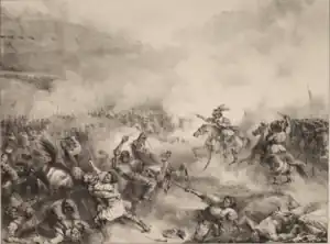 The fierce fighting along Horn's front accumulated thick clouds of gunpowder smoke and dust, which with strong westerly winds spread across the entire battlefield. These greatly obscured both the commander's ability to survey the battle and the soldiers' ability to recognize their own comrades. At five o'clock in the afternoon, the action at Horn's front had been going on for an hour. Hepburn signaled his musicians to play Scottish marching music to prevent his Scottish troops from getting lost in the smoke.[142] The repeated and concentrated volleys from Horn's and Hepburn's musketeers, coupled with the heavy cannonade from their regimental artillery, forced the remnants of the Imperial-League infantry to stall their attacks, leading to the men being crowded together and losing their momentum. Despite the heavy resistance, Tilly refused to withdraw and his infantry continued to put up heavy pressure on Horn's troops. But his positions had very limited room to manoeuvre and were slowly being pushed back by strong counterattacks made by Horn's and Hepburn's troops.[135][145][94][130][129][143][139]