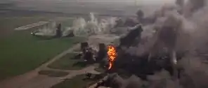 Filming in England was at Duxford, Debden, North Weald and Hawkinge, all operational stations in 1940; one surviving First World War "Belfast" hangar at Duxford was blown up and demolished for the Eagle Day sequence. Some filming also took place at Bovingdon, a former wartime bomber airfield. Some aerial shots were also taken over the former RAF Sywell (now Sywell Aerodrome).[15] The title sequence scene, showing a review of German bombers on the ground by Fieldmarshal Milch, was filmed at Tablada aerodrome in Spain.[12][16] Stunt coordinator Wilson Connie Edwards retained a Mark IX Spitfire, six Buchons, and a P-51 Mustang in lieu of payment,[17] which were stored in Texas until sold to collectors in 2014.[18]