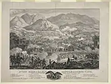 A great many images of the battle were produced for public consumption in the U.S., the most famous of which is the scene of battle done from a sketch by Taylor's aide-de-camp, Major Eaton. Eaton made notes of the battlefield, recorded the topography, and queried other battle participants. The published battle scene was large, (19 1/4 inches x 29 1/4 inches; 48.9 x 74.9 cm.). It was offered for sale to the public on September 15, 1847, while the war continued. In contemporary accounts, it was praised for its accuracy concerning the topography as well as its beauty. A modern assessment of the battle scene points to the inconsistencies common among battle scenes; that is, the reduction of troop numbers and oversimplification of movement.[35] Many images depict the fierce nature of the combat and the captions of some of the images seek to highlight the valor of particular troops and asserting the U.S. victory. Carl Nebel's painting is part of a series he did, documenting battles of the war, illustrating journalist George Wilkins Kendall's The War Between the United States and Mexico, Illustrated, but Kendall did not visit the Buena Vista battle ground, and likely neither did Nebel. Kendall credited Carleton's account of Captain John P. O'Brien's holding the U.S. line and control of the guns. Nebel does not credit Eaton's lithograph of the battle scene.[36]
