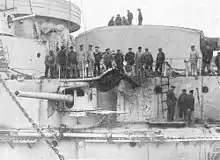 At 12:02 Yavuz's first artillery officer could make out the Russian ships through the fog and ordered the crew to target Evstafi. The first salvo overshot the ship, though one shell pierced the center funnel and caused splinter damage to the wireless antennae. The Ottomans' third salvo scored two hits on Evstafi. The first one disabled the forward starboard 6-inch casemated gun and caused casualties among its crew. The second shell penetrated the casemate armour, setting fire to some 6-inch cartridges and detonating in the officers' galley, causing severe damage while some splinters penetrated the deck and went into the boiler room below. A near miss caused extensive splinter damage to an unarmoured part of the ship, destroying a bulkhead in the infirmary.[3]