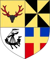 For his success, Campbell of Inverliver was rewarded with the £20 land of Inverliver.[1] According to tradition, upon Muriel being seized a nurse bit off a joint in her little finger in order to mark her identity.[4] Upon the Campbells being congratulated on their safe arrival, someone asked what should be done if Muriel died before she became of marriageable age, to which Campbell of Auchinbreck replied that "she can never die, as long as a red-haired lassie can be found on either side of Loch Awe".[4] A legal fight ensued and in 1502 Muriel's right as heiress was established in law.[6] The following year the old Thane of Cawdor died leaving his sons to carry on the quarrel for some time.[6] In 1510, Muriel was married to Sir John Campbell who was the second or third son of Argyll.[8][5][2] Sir John Campbell then received the estate of Calder,[5][2] and his and Muriel's descendants are the Earls Cawdor and the chieftains of the Clan Campbell of Cawdor. In memory of the marriage, in the old hall of Cawdor Castle is cut, "S.I.C" and "D.M.C", with the inscription "Ceri manimemineris mane".[2] Another interpretation of this is that it says "S.J.C" (Sir John Campbell) and "M.C" (Muriel Calder) but from the style of the carvings it appears that it was from a later generation.[9]