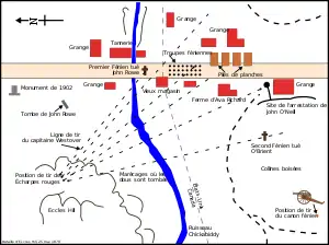On May 25, 1870, a force of Canadian militia and armed citizens awaited the Fenians at the summit of Eccles Hill. When the Fenians charged the Irish (?), it was a perfect time for James Pell of Dunham to crawl up to top of the hill. James Pell took out his musket and looked to aim at the first person wearing green rushing to the top of the hill. In the silence, James fired a shot and a hit Fenian John Rowe in the neck. Then the Fenians were treated to a hail storm of gunfire from the Canadian bullets after Pell's commanding first shot. Even though they had discussed many times, they squeezed off their first rounds only when the green (the Fenians wore leftover Union clothing with a green jacket) and blue figures reached Canadian soil. The Canadians were fortified behind the hill, and the firing soon became a steady firefight. Many of the younger soldiers were struck with panic at the sight of their fallen comrade and their first taste of combat.[2] This halted the advance of the Fenians, who took cover and returned fire. Lieutenant-Colonel William Osborne Smith hurried to the field with a force of Canadian militia volunteers. Together with the armed citizens, the Canadian militia charged the Fenian into defensive fighting positions. Many Fenian Soldiers disbanded and hid behind walls, some jumped into the water, and in the midst of this gun fighting, William O'Brien of Moriah was shot dead. The Canadians drove the Fenians into retreat as a hail of ammunition shot around them, leaving behind their artillery and two dead soldiers. This was significant to the Canadian battalion and this volunteer since the Canadians were outnumbered by the Fenians nearly six to 1. Nevertheless, the Canadians suffered many casualties during the engagement, but none were fatal.