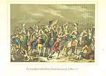 The truce was broken around midday when it had become clear that Müntzer was not going to be delivered up to the Princes. Starting with an artillery barrage followed by waves of horse and footsoldiers, the princes caught the peasants off guard and they fled in panic into the town, followed and continuously attacked by the mercenaries. Most of the insurgents were slain in what turned out to be a massacre. Casualty figures are unreliable but peasant losses have been estimated at more than 7,000 while the Landsknecht casualties were estimated to be as low as six.[5] Müntzer himself was captured in the town, tortured, and finally executed at Mühlhausen on May 27, 1525.