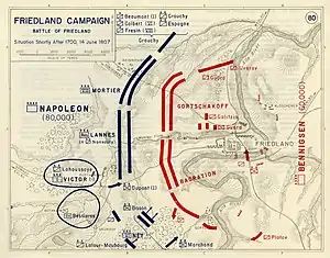The engagement at Friedland was a strategic necessity after the Battle of Eylau earlier in 1807 had failed to yield a decisive verdict for either side. The battle began when Bennigsen noticed the seemingly isolated reserve corps of Marshal Lannes at the town of Friedland. Bennigsen, who planned only to secure his march northward to Wehlau and never intended to risk an engagement against Napoleon's numerically-superior forces, thought he had a good chance of destroying these isolated French units before Napoleon could save them, and ordered his entire army over the Alle River.[13] Lannes skillfully held his ground against determined Russian attacks until Napoleon could bring additional forces onto the field. Bennigsen could have recalled the Russian forces, numbering about 50,000–60,000 men on the opposite bank of the river, and retreated across the river before the arrival of Napoleon's entire army but, being in poor health, decided to stay at Friedland and took no measures to protect his exposed and exhausted army.[13] By late afternoon, the French had amassed a force of 80,000 troops close to the battlefield. Relying on superior numbers and the vulnerability of the Russians with their backs to the river, Napoleon concluded that the moment had come and ordered a massive assault against the Russian left flank. The sustained French attack pushed back the Russian army and pressed them against the river behind. Unable to withstand the pressure, the Russians broke and started escaping across the Alle, where an unknown number of them died from drowning.[14] The Russian army suffered horrific casualties at Friedland–losing over 40% of its soldiers on the battlefield.[15]
