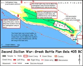 The Carthaginians were camped to the west of Gela and Dionysius planned a three-pronged attack[20] that had to follow a precise timetable. The Carthaginian cavalry was posted on the landward side while the mercenaries were on the seaward side, with the Africans in between inside the camp. Dionysius, observing that a seaborne force could attack the camp from the south, where it was open and lightly defended, decided on the following course: