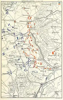The battlefield extended from the woods bordering the Moselle above Metz to Roncourt, near the river Orne.[5] Other villages that played an important part in the battle were Saint Privat, Amanweiler or Amanvillers and Sainte-Marie-aux-Chênes, all lying to the north of Gravelotte.[6][7]