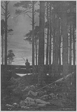 The Swedes resisted stubbornly, the artillery on both sides duelled near the highway while the infantry fought intensely out on the bog; some Swedish battalions counterattacked and pushed several Russian lines back, until their reserve gave them enough weight to repulse the Swedish attack. Jankovitj then reinforced his right flank with two battalions from the reserve — to encircle the Swedish left and gain access to the highway from behind — while his other battalions increased their activity at the front; this forced Fieandt to withdraw one kilometre, where he once again made a brief stand at a forest edge to buy time for the collection of wounded, before he eventually ordered a retreat towards Tunkkarin Silta, five kilometres away. The skirmish at Kokonsaari had proved to be one of the more intensely fought engagements during the whole war.[1] The Swedish casualty report mentioned 159 privates and seven officers killed or wounded, however, this number excludes missing (an additional killed and captured); it is therefore likely that the total casualties in dead and wounded reached a sixth of their fighting force, excluding the prisoners. The Russians had lost 16 officers and around 300 privates. The Swedish force had stood well up against the much larger Russian and their retreat had been executed in good order.[4]