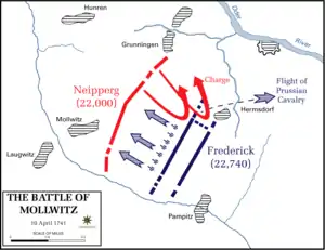 At the beginning of the battle, the Prussians had the larger army.[24] They also had three times the field guns than the Austrians had; however, the Austrian cavalry outnumbered the Prussian cavalry two to one.[25] The Prussian forces advanced toward the Austrians in two lines while the Prussian artillery began bombarding the Austrian line. Six regiments of Austrian cavalry on the extreme left flank of the Austrian line, numbering 4,500 to 5,000 men and horses,[26] were goaded by the Prussian bombardment to charge the Prussian right flank without orders from Neipperg.[27] The charge shattered the Prussian cavalry, who received the attack while at a full halt.[28] Frederick was with the Prussian cavalry and was caught up in its rout.[29] This left the Prussian flank open to attack, and the Austrian cavalry then turned on the unprotected infantry.[30] Schwerin, the Prussian military commander under Frederick, now advised the king to leave the battlefield because it looked as though the Prussian army was about to be defeated; Frederick heeded this warning.[31] Abandoning the field, he was nearly caught and almost shot.[32] Frederick's absence allowed Schwerin, a veteran general, to take command of the troops himself.[33][lower-alpha 2]