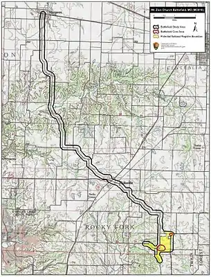 On December 28 at about 2 a.m., Prentiss set out with his entire force to meet Dorsey's force. While the State Guardsmen numbered around 900, most appear to have been local volunteers, many of whom were not armed with military weapons (although many had personal civilian firearms of various types). A detachment of Prentiss's force routed one company of Guardsmen on the road from Hallsville around 100 yards east of Mount Zion Church and learned that the rest of the force was in the churchyard, situated on a high hill. The main campground was actually in a thicketed hollow immediately east of the church. Prentiss advanced on the State Guard positions, making three charges.[1] At the third, the Confederates exhausted their ammunition, fell back to their wagons, and were overrun. The battle ended around 11 a.m.[2][3]