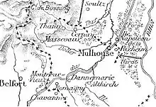 The Landwehr fought a delaying action as the French advanced from Belfort with two divisions on the right passing through Dannemarie at the head of the valley of the Ill river. On the left flank, two divisions advanced with Chasseur battalions, which had moved into the Fecht valley on 12 August. On the evening of 14 August, Thann was captured. The most advanced troops had passed beyond the suburbs of Cernay and Dannemarie on the western outskirts of the city by 16 August. On 18 August, VII Corps attacked Mulhouse and captured Altkirch on the south-eastern flank as the northern flank advanced towards Colmar and Neuf-Brisach.[19]