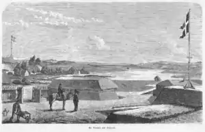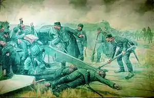 A dense fog this morning made it extremely difficult to determine enemy movements, and consequently only a few shots were fired from the Danish guns in the bastions as the Prussians closed in on Mysunde. At 11:30, the 1st Battalion of the 3rd Danish Regiment arrived at Mysunde under the command of Captain Arntz, and along with a squadron of dragoons, the force carried out a reconnaissance in front of the bastions. A thousand paces in front of the bastions, they encountered the fusilier battalions of the 15th and 24th Prussian Regiments and came under intense fire. Lieutenant Hagemann of the 24th Regiment was the first Prussian officer to be killed, but Major v. Krohn lead the Fusilier Battalion in a bayonet attack that threw the Danish infantry back. With several officers wounded or killed, Captain Arntz ordered his battalion into position at the bastions. It is only at this point, that the Danish commanders realised that they were facing not just a Prussian reconnaissance force, but an actual assault on the fortifications.[3][4][5]