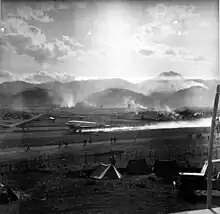 Colonel Gilles, who wanted to take back the two points so close to Nà Sản's headquarters, launched a counter-attack at dawn on 1 December. After a barrage of artillery fire, two companies of the 2e BEP stormed and took back 22 bis. After 7 hard-fought hours, the 3e BPC took back P.A. 24. At 9:00 PM, General Giap's forces launched their all out offensive at Nà Sản. Wave after wave of soldiers relentlessly assaulted several P.A.s, especially 21 bis and 26; sometimes the attackers outnumbered the defenders fifteen to one. All night, Dakotas dropped flares over the battlefields to give support troops visibility to defend the positions. Defending forces continuously fired their cannons into Việt Minh human waves while B-26s, Hellcats and Privateers dropped bombs and napalm onto enemy attack waves and positions. The battles raged on until mid-morning on 2 December when all attacks abruptly stopped, leaving behind an eerie silence.[5]