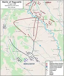 At dawn on 19 April, Wohlgemuth ordered Strasdil's brigade to attack Nagysalló, Kissalló and Hölvény[20] (two villages around it, which became years later parts of Nagysalló), which they accomplished, chasing Klapka's vanguard out of from there.[21] Klapka, when he heard the gunshots, immediately rushed to Hölvény,[10] where after reorganizing these units, and bringing the rest of his corps northwest from Nagysalló,[20] he decided to retake the place and also informed Damjanich and Gáspár about the start of the battle.[21] Hearing about the situation Damjanich immediately sent the Wysocki division to help Klapka's counter-attack.[10] When the Wysocki division arrived, at 9 a.m. Klapka ordered the counter-attack as follows: the Dipold brigade of the Dessewffy division had to advance, through the Hölvény woods, to the Zálogos forest southeast from Nagysalló, the Kazinczy division had to push on the carriageway towards the northern entrance of the village, on their left the Wysocki division had to attack Nagysalló from the northeast, while General József Nagysándor with the bulk of the cavalry, formed of 6 cavalry companies of the I. corps and the cavalry of the III. corps, had to secure their left. As reserve remained the Bobich brigade of the Dessewffy division at the Hölvény forest, holding also the heights north of Fakóvezekény, and the Knezich division of the III. corps took position north of Hölvény.[10]