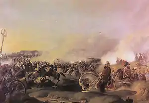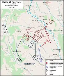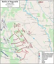 Around 3 o'clock, when the cavalry, slowed down by the wet and swampy terrain, finally took their position, János Damjanich gave the order for the decisive attack against the Jablonowski division.[10] Seeing his troops’ lack of success, Wohlgemuth was thinking of retreating, but he was waiting for Veigl's and Perin's brigades advancing from Bese and Köbölkút towards Jászfalu, to join his main body. However, at this very moment the cavalry and a cavalry battery of the Hungarian VII Corps, led by Colonel Ernő Poeltenberg appeared on his right flank.[21] The VII Corps had started to cross their bridge over the Garam at Zsemlér as soon as it was ready, at 7 o'clock in the morning. Hearing the gunfire, Gáspár urged his troops to hurry across and join the battle. He ordered them into battle to the left of Nagysalló: the artillery and cavalry to support the III Corps, one of Poeltenberg's brigades being sent in Nagysalló to observe the road towards Zselíz.[21] Those of his troops who crossed after this also marched towards Nagysalló. Two Hungarian battalions tried to outflank the village from the left, while the attack of the Waldberg brigade forced the remaining imperial troops to retreat from it.[24] The Hungarian artillery fired so effectively upon the enemy artillery that this was forced to retreat.[21] The retreating imperial artillery tried to redeploy further back, but after the VII Corps sappers had bridged two ditches for it, the Hungarian artillery advanced and drove the imperial guns away again.[25] Thus the 4th Sándor Hussar Regiment led by Poeltenberg, together with the cavalry of III Corps under General Nagysándor, and a horse artillery battery obliterated the imperial cavalry on the left flank at Nagymálas.[22][26]