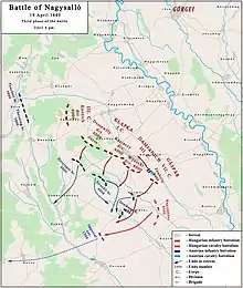 An hour later also Damjanich arrived on the battlefield in the middle of the deployment of the troops, and gave the order, accordingly to Klapka's plans, to start the attack.[10] The action began at 10 o'clock with a heavy artillery duel,[22] and although the Austrians were in a very good defensive position, unleashing a devastating cannonade against the attackers, the Hungarian I. corps retook Hölvény and Kissalló, forcing the Austrian units from there to retreat to Nagysalló[20] During these heavy fights the two villages caught fire.[20] Then the Czillich and Leiningen brigades of the III corps Wysocki division, together with the Kazinczy division of the I. corps, attacked Nagysalló from the northeast and north, and recaptured it after heavy bayonet combat around 11 o'clock.[20] In the fight to recapture Nagysalló one of the most feared Hungarian units, the 3. "white feathered" battalion distinguished itself under the leadership of their equally famous commander lieutenant colonel Károly Földváry (the hero of the battles of Tápióbicske and Vác), by executing a bayonet charge against the enemy battalions, and pushing them in a back street, where they crammed, being massacred by the 3. battalion. The attack of the Hungarians caused the Austrians to rout, being chased by the Hungarians until the edge of the village.[23] General Damjanich, in his battle report, wrote that the streets of Nagysalló were filled with dead bodies after the fight,[20] and the Strasdil brigade retreated to the heights northwest of Nagysalló.[10] During the attack of the Wysocki divisions infantry, the cavalry, supported by the cavalry batteries, attacked the Austrian artillery units positioned at the southeastern edge of Nagysalló, routing them completely.[20]