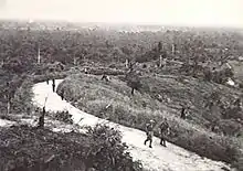 The Allies assessed that Beaufort, which lay on the main Japanese avenue of withdrawal, was held by between 800 and 1,000 Japanese troops seeking to keep key egress routes open.[42] On 27 June, the Australians attacked the town.[48] The 2/43rd Battalion was assigned the task of the main assault, while the 2/32nd Battalion was tasked with flank protection. Despite being hamstrung by torrential downpours and unforgiving terrain, the 2/32nd Battalion secured the south bank of the Padas River, while one company from the 2/43rd was sent to take the town and another marched to the flanks, to take up ambush positions along the route that the Japanese were expected to withdraw along. The 2/28th Battalion secured the lines of communication north of the river.[47] The resistance from the Japanese defenders was not co-ordinated and as a result the Australians had secured their objectives by nightfall. Throughout the night, however, the Japanese launched six counterattacks which eventually broke down into hand-to-hand combat. During the course of these actions, one company became isolated and the next morning, 28 June, another was sent to aid it by attacking the Japanese force from the rear. Fighting its way through numerous Japanese positions throughout the afternoon, the company reached its objective in the early evening and launched its assault, killing at least 100 Japanese defenders.[49][50] It was during the course of this action that Private Tom Starcevich, of the 2/43rd Battalion, performed the deeds for which he was later awarded the Victoria Cross.[51]