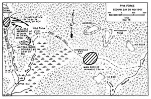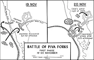 On the morning of 20 November, the Japanese counterattacked and attempted to outflank the Marine positions along the Numa–Numa Trail. The attack was driven back, taking up positions and then harassed the Marines with sniper fire and mortar fire. The 3rd Battalion, 3rd Marine Regiment advanced towards the two forks of the Piva River to clear the threat, and two light tanks were disabled during the close fighting along the trail.[10] The 3rd Marine Raiders took up positions to cover the gap between the 129th Infantry Regiment and the 3rd Marine Regiment as the front expanded.[10]