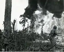 Resistance to the 3rd Marine Regiment advance was strong, with all three battalions engaged with the Japanese.[15] The 3rd Battalion, 3rd Marine Regiment—having crossed the Piva River without trouble—advanced toward a slight rise, and as the lead scouts came over the top of this ridge, the Japanese opened fire from reverse slope positions. Pinned down, the scouts held their positions while the rest of the battalion moved forward with a strong charge over the ridge and cleared the area of Japanese.[15] 90 mm mortar fire then rained down on the Marines, who sheltered in the foxholes that the Japanese had dug throughout the area. Suffering a number of casualties, the 3rd Battalion, 3rd Marine Regiment established itself in a defensive night position.[15]