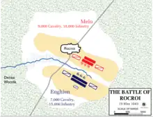 The French army was arranged in two lines of infantry in the center, squadrons of cavalry on each wing, and a thin line of artillery at the front. The Spanish army was similarly positioned but with the center infantry in their traditional "tercio" squares, with some 8,000 highly trained Spanish in front and mercenary infantry behind them.[4] The two armies exchanged fire in the afternoon of 18 May, but the full battle did not occur until the following day.