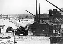 By 17 October 1941 the Mius River was crossed by the 14th Panzer Division and Taganrog was captured by German troops, with the mountain troops entering Stalino, forcing the newly formed 12th Army into a renewed withdrawal. However, the autumn rains had begun, and the Rasputitsa ("roadlessness") had set in slowing the 1st Panzer Army's advance to "meter by meter".[7] This meant that the leading German units did not reach the outskirts of Rostov until mid-November, having lost contact with the Red Army in the meantime.[8]