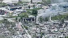 Ukraine reported on 3 May, that Russian aircraft bombed a grain elevator in Rubizhne. The grain elevator, owned by Golden AGRO LLC and opened in 2020 was completely destroyed.[37] Also, on 3 May, the village of Mykhailivka near Rubizhne was shelled, St. Elijah's Monastery Barbarian and rector of the church of St. Theodosius of Chernihiv in Mykhailivka, hieromonk Parthenius died.[38] On 4 May, Ukrainian forces claimed that Russian forces tried to take full control of Rubizhne without success.[39] It was reported that Russian forces seized Rubizhne and the nearby town of Voevodivka on 12 May 2022.[1] The BBC claims that during the fighting for Rubizhne up to 1500 shells per day were fired before Russian forces advanced.[40]