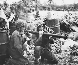 Two Marine PFCs display the bazooka they used to disable Japanese tanks on Saipan.