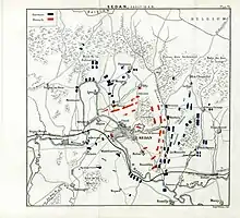 This was the opening engagement, as the French 1st Corps had barricaded the streets, and enlisted the aid of the populace.[9] Von der Tann sent a brigade across pontoon bridges at 04:00 in the early morning mist, the Bavarians rushing the village and capturing it through surprise.[9] The French Marines of the 1st Corps fought back from stone houses and the Bavarian artillery shelled the buildings into rubble.[9] The combat drew new forces, as French brigades from the 1st, 5th, and 12th Corps arrived. At 08:00 the Prussian 8th Infantry Division arrived, and von der Tann decided it was time for a decisive attack. He had not been able to bring artillery to bear from long range, so he committed his last brigade to storm the town, supported by artillery from the other side of the Meuse. His artillery reached Bazeilles at 09:00.[12]