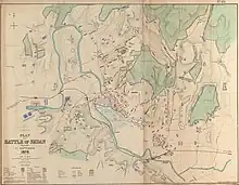 After a major defeat in which he lost 7,500 men and 40 cannons, MacMahon aborted the planned link-up with Bazaine and ordered the Army of Châlons to withdraw north-west towards the obsolete 17th-century fortress of Sedan.[5] His intention was to rest the army, which had been involved in a long series of marches, resupply it with ammunition and, in his words, maneuver in front of the enemy.[6] MacMahon underestimated the German strength and believed the hills surrounding Sedan would offer a major defensive advantage.[7] The French rear was protected by the fortress of Sedan, and offered a defensive position at the Calvaire d'Illy, which had both hills and woods to provide cover for any defense.[7] MacMahon denied a request from General Félix Douay, commander of 7th Corps, to dig trenches, claiming the army would not remain at Sedan for long.[7]