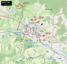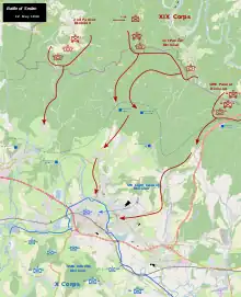 The X Corps' attack involved a strike on the left flank by the 213th Infantry Regiment and 7th Tank Battalion, and on the right flank by the 205th Infantry Regiment and 4th Tank Battalion.[72][75] The right flanking force arrived late, so the 213th Infantry and the 7th Tank Battalion advanced alone on the north axis. It was thought that the 213th could reach an area in between Chéhéry and Bulson in one hour fifty minutes and the 7th Tank Battalion in two hours.[72] Yet it was not until 17 hours after the original order to advance to Bulson that the lead French tanks reached the Bulson ridge. They found the Germans had beaten them there by a few minutes.[72]
