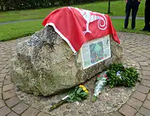The first memorial is located in the village on Main Street (A116).[24] The monument's inscription reads (in both English and Norwegian):