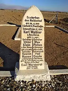 The Battle of Trekkopjes on 26 April 1915[2] was a German assault on the South African held railway station of Trekkopjes during the South West Africa Campaign of World War I. The South African Major Skinner had been ordered to defend Trekkopjes, and came into contact with a German column advancing on the station. Skinner withdrew back into Trekkopjes and dug in his forces. The German attack was repulsed with the help of armoured cars, leaving the South Africans victorious. The Battle of Trekkopjes saw the last German offensive in German South West Africa leaving them on the defensive for the remainder of the campaign.