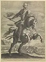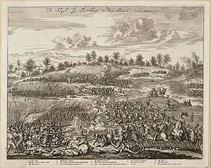 With the Spanish cavalry having been driven off, the Dutch and English cavalry fell upon the disordered Spanish infantry. The Walloon regiments tried to form a line with the flank protected by a copse, but their morale was already low after witnessing the flight of their cavalry. When they saw in the distance the mass of Dutch infantry approaching to support their cavalry they broke and tried to swim across the Aa river to reach Herentals. The musketeers of Sultz's regiment fell back in confusion upon the pikemen behind them and the whole formation promptly surrendered en masse upon being charged by the Anglo-Dutch cavalry. The veteran tercio under Treviso managed to deploy in combat formation and resisted manfully for some time, but Vere and Bacx's charge upon them was decisive.[1] The Dutch and English troopers rode up very close to the massed ranks of the Spanish infantry and discharged their pistols and carbines at point-blank range, inflicting carnage. Varax, fighting in the front line with his men, was among the casualties.[20] The cuirassiers' fire opened gaps within the Spanish ranks into which the troopers rode in and started attacking the formation from within, rapidly causing a rout.[6]
