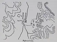 After ordering his fleet to sail to Utica, Curio began his march there around the gulf. Within three days he had reached the southern bank of the Bagradas river. Leaving the infantry there with Rebilus, he took his cavalry and rode northward to scout out a camp near Utica, the Castra Cornelia,[13] situated on a hill to the west of the town.[14] From that position he was able to assess Varus's camp, which was situated next to the town, with his further side protected by Utica's north-eastern wall, while his nearer side was protected by the sea and an outdoor theatre, ensuring that his camp could only be approached by a narrow passage.[14] Turning south, he noticed a stream of fugitives fleeing to the safety of Utica's walls, and he decided to attack the crowds to instil panic.[15] This forced Varus to send 1,000 Numidian troops (600 cavalry and 400 soldiers) to their rescue. The two forces clashed and the Numidians, unused to close fighting, were repulsed, losing 120 men in the process, as the remainder of the troops retreated to the town.[15]