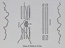 Returning victorious to his camp on the Bagradas, the legions acclaimed him as Imperator.[15] The next day he ordered his forces to march towards Utica, but instead of heading towards the Castra Cornelia which he had spied out for his camp, he decided to take the offensive and placed himself on a ridge to the south-west of the town.[15] His soldiers were still preparing their camp when patrols reported seeing large Numidian reinforcements on their way, King Juba having sent them to reinforce Varus's position. When they came into view, Curio, who had not bothered to send out scouts, started showing signs of nervousness.[15] He urgently sent out his cavalry to impede the Numidian advance, while he impatiently recalled his legionaries from the trenches and began to line them up in battle formation.[15] His cavalry engaged the Numidians who, approaching in a disorganized fashion, were caught unawares and were dispersed with heavy losses. Before Curio could send his legions in, the Numidian cavalry had escaped from the slaughter, and quickly made their way into the town.[15]