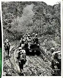 The soldiers of the 32nd were assisted by a battalion of Filipinos, the Buena Vista guerrillas, which operated in the rear of the Japanese defenses.[3] Captain Ray C. Hunt was the liaison between the Americans and Filipinos.[5] The U.S. planners anticipated that the advance on the Villa Verde trail would be accomplished rapidly and that on arriving at Santa Fe the 32nd division would be in the rear of Japanese defenders at Balete Pass (now Dalton Pass) on Route 5. The planners were wrong and the Battle of Villa Verde Trail would be long and difficult.[2]