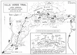 The Battle of Villa Verde Trail (Filipino: Labanan sa Tugaygayan ng Villa Verde) was a campaign by the United States Army and Filipino guerrillas in the Philippines during World War II in 1945 to force its way across the Caraballo Mountains from the Central Luzon plain to the Cagayan Valley. Somewhat to the surprise of the Americans, the Japanese had constructed strong defenses along the narrow and winding Villa Verde Trail, 27 mi (43 km) in length. The campaign began on 21 February 1945 and concluded with the success of the Americans on 31 May 1945. The U.S.'s 32nd Infantry Division, called the Red Arrow Division, carried out the campaign with assistance from Filipino guerrillas.