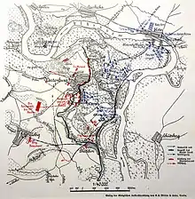Blücher's army arrived in Elster on 2 October, replacing a force under Bülow which withdrew to rejoin the Army of the North.[5] That evening he established two pontoon bridges across the Elbe and began to feed across the first elements of Yorck's I Corps.[6] They found the ground unexpectedly marshy and cut with backwaters, which made it very difficult to deploy upon. Ahead of them a long dike separated them from the village of Wartenburg and the dry land beyond.[7] The dike was a perfect breastwork behind which the French could deploy their infantry, and the lack of cover made it an ideal killing ground.[5]