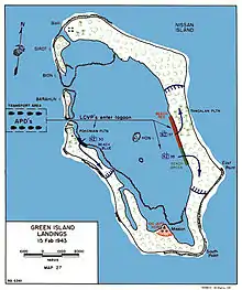 The fighting was brief but sharp on land with heavier resistance in the air.[18] Prior to the landing, as the assault force steamed towards the islands, a large group of Japanese aircraft were dispatched from Rabaul to attack the naval task force. The landing craft and transports escaped damage, but the cruiser St. Louis, which formed part of the southern covering force, was hit resulting in 23 killed and 28 wounded. Later, a group of dive bombers appeared over the landing craft as they were forming up to the west of the islands, but the Japanese aircraft were promptly dealt with by the escorting AirSols fighters from Cape Torokina, which quickly gained control of the air over Nissan Island. In all, the Japanese lost 12 aircraft. Apart from a near miss on LST-446, the landing proceeded quickly and smoothly.[19] After being crossloaded from the transports, the infantry were ferried ashore in LCIs and LCP(R)s, which proceeded to enter the lagoon to the south of Barahun Island. Troops disembarked at several landing beaches around the Pokonian and Tangalan Plantations.[20] In total 5,800 personnel were landed on 15 February, of which over 4,200 were New Zealanders.[1]