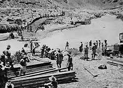 The 21st Australian Brigade advanced along the coast road heading for Beirut and attempted to cross the Litani River. A surprise night time landing by the British No. 11 (Scottish) Commando, under the command of Lieutenant Colonel R.L. Pedder (Highland Light Infantry), was attempted in order to seize the bridge near the mouth of the river, but was delayed by rough seas on the proposed landing beach. This gave the Vichy French defenders enough time to destroy the bridge. When the commandos eventually landed in daylight, in three separate places, the initial landing was almost unopposed due to the defenders being in combat against the Australian troops,[2] subsequently in the fighting they took heavy casualties, among them Pedder, who was killed in an assault on the French barracks. He was succeeded in command by Geoffrey Keyes, whose party was ultimately able to secure the crossing by getting over the river in canvas boats with the help of some of the Australian troops.[3]