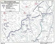 Task Force Zebra, led by Lt. Col. Elbridge Brubaker, commander of the 72nd Tank Battalion, now included all but one company of the tank battalion; the 2nd Battalion, 23rd Infantry Regiment; the 1st Ranger Company; the Ivanhoe Security Force (a provisional company of ROK troops originally organized for division rear area security missions); and the ROK 3rd Battalion, 36th Regiment, attached from the ROK 5th Division. The ROK battalion occupied a patrol base along the trace of Line Missouri and the Ivanhoe Security Force a forward blocking position adjacent to the 38th Infantry's ROK Rangers on the west flank. On the No Name Line, the 2nd Battalion, 23rd Infantry, Company C of the tank battalion and the Ranger Company stood along both Route 24 angling in from the northeast through the Hongch'on River valley and a minor road running down a valley from the northwest and joining Route 24 just behind the task force position. West to east on ridges commanding the two roads were Companies F, E and G and the Rangers. The tanks stood behind barricades of wire and minefields blocking both valleys, though not the roads, which had been left free of obstacles to allow patrols to pass through. Company B of the tank battalion, in reserve, and the trains and command post of the 2nd Battalion, 23rd Infantry, were at the valley village of Chaun-ni (37°52′01″N 128°01′05″E / 37.867°N 128.018°E), on Route 24 2 miles (3.2 km) behind the lines. Colonel Brubaker's command post was farther down Route 24 at the village of Putchaetful (37°50′17″N 128°01′01″E / 37.838°N 128.017°E).[4]: 448